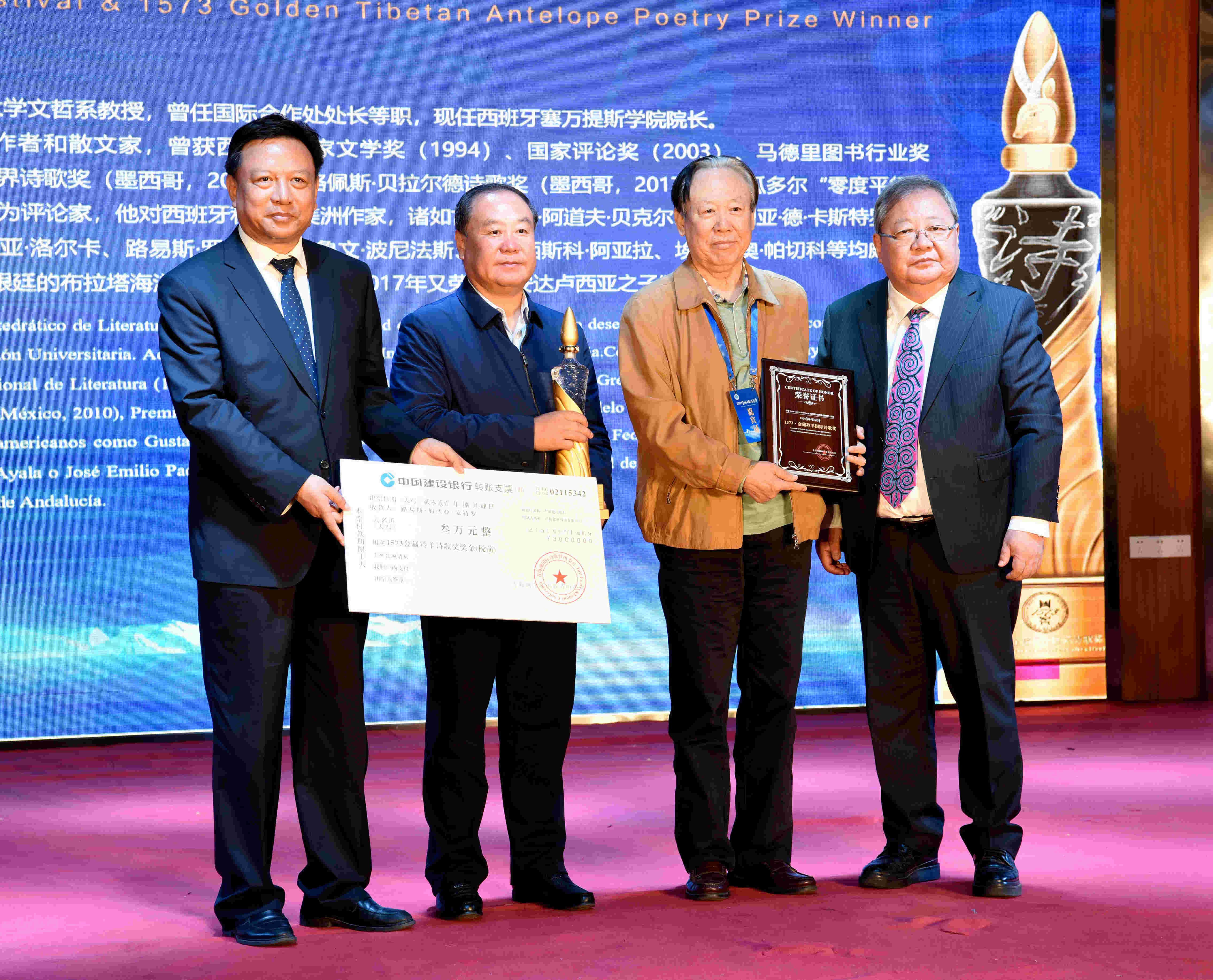 北京大學西語系教授趙振江上臺代為領獎,中共海北州委書記班果、青海省人大常委會副主任張黃元,評審會主席吉狄馬加一起為今年的1573金藏羚羊詩歌獎頒獎并合影留念(陳文年 攝)