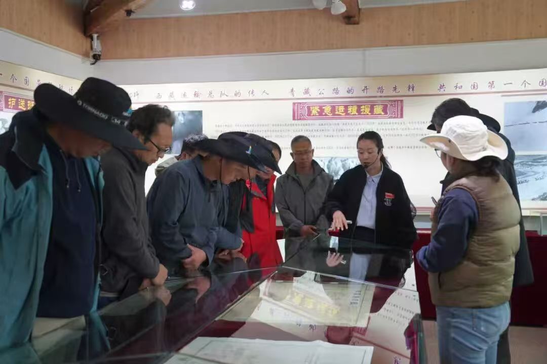 采風(fēng)首站聚焦青藏駝隊(duì)歷史陳列館,館內(nèi)大量實(shí)物、圖片與文獻(xiàn)資料,將駝場(chǎng)建設(shè)歷程徐徐鋪展。“一不怕苦、二不怕死,頑強(qiáng)拼搏、甘當(dāng)路石,軍民一家、民族團(tuán)結(jié)”的“兩路”精神,在泛黃老照片與斑駁工具中愈發(fā)清晰;隨后探訪的駝工禮堂、窯洞遺址及養(yǎng)殖場(chǎng),更讓藝術(shù)家們沉浸式觸摸歷史溫度:粗糙土墻、褪色油燈與修補(bǔ)炕席,重現(xiàn)先輩“戰(zhàn)天斗地”的建設(shè)場(chǎng)景;養(yǎng)殖場(chǎng)旁健壯的駝群,則奏響“艱苦創(chuàng)業(yè)”與“傳承發(fā)展”的時(shí)空交響。